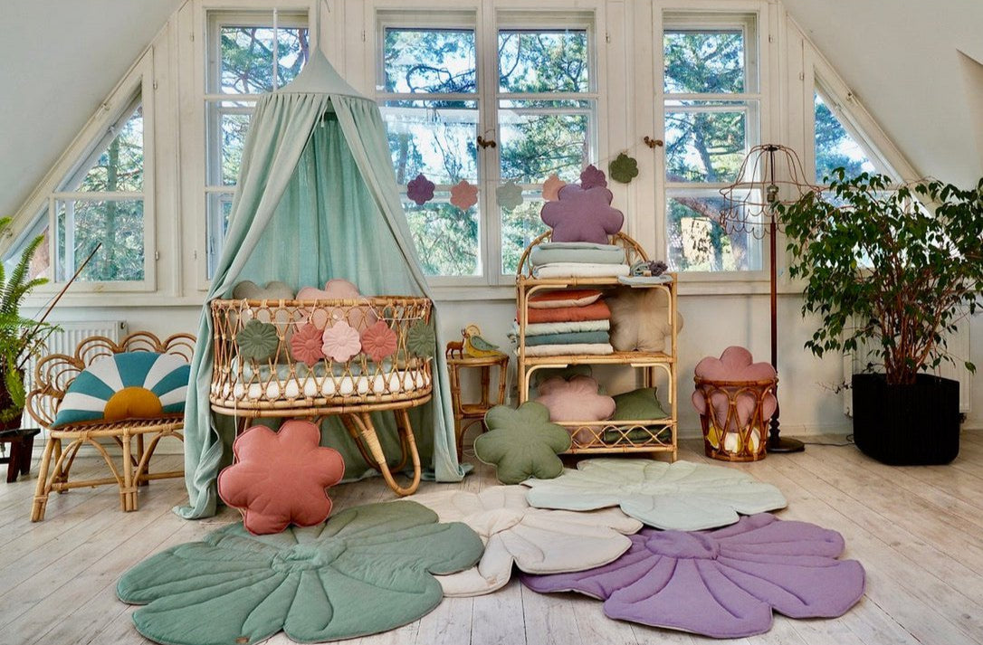 Blütenzart & verspielt: Diese traumhafte Blumenmatte von Moi Mili bringt den Frühling ins Kinderzimmer – das ganze Jahr über. Ob als Spielteppich, weiche Unterlage unter dem Baldachin oder dekorativer Blickfang: „Sandlilie“ ist ein echtes Lieblingsstück für kleine Träumer:innen.