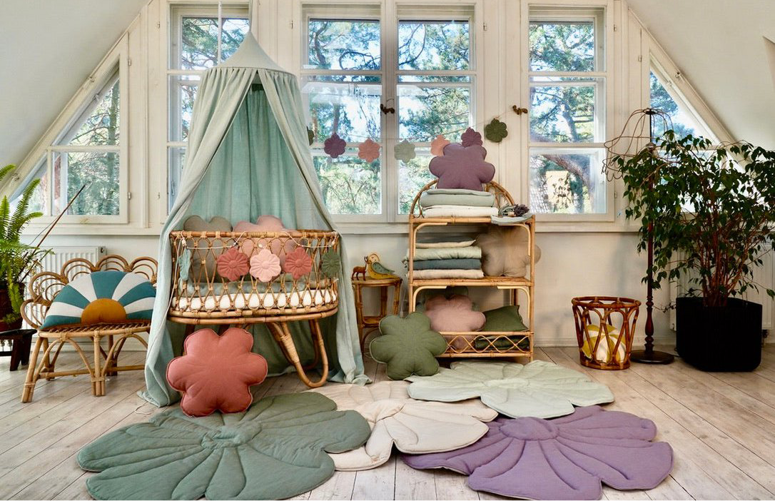 Blütenzart & verspielt: Diese traumhafte Blumenmatte von Moi Mili bringt den Frühling ins Kinderzimmer – das ganze Jahr über. Ob als Spielteppich, weiche Unterlage unter dem Baldachin oder dekorativer Blickfang: „Violett“ ist ein echtes Lieblingsstück für kleine Träumer:innen.